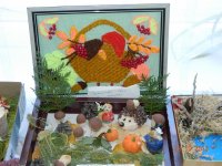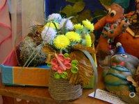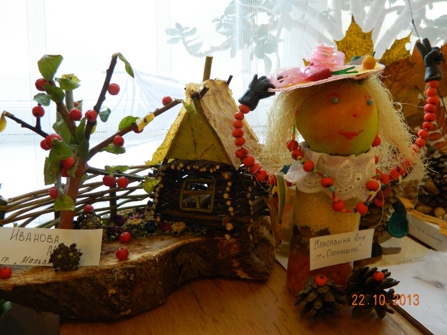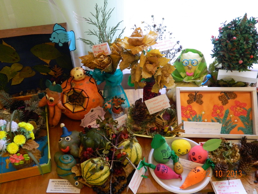 Одновременно с праздниками в зале была оформлена выставка работ из природного материала «Осенние фантазии». Чего здесь только не было: букеты из листьев, композиции, кареты из тыквы, паучки из яблок, ежи из картошки и много-много всего интересного. Сколько радости и гордости было у детей, когда они видели свои работы.