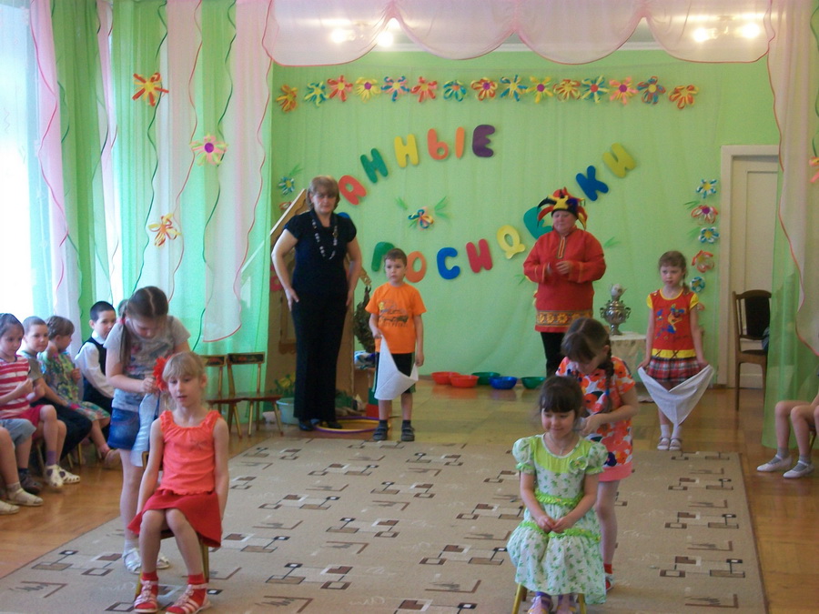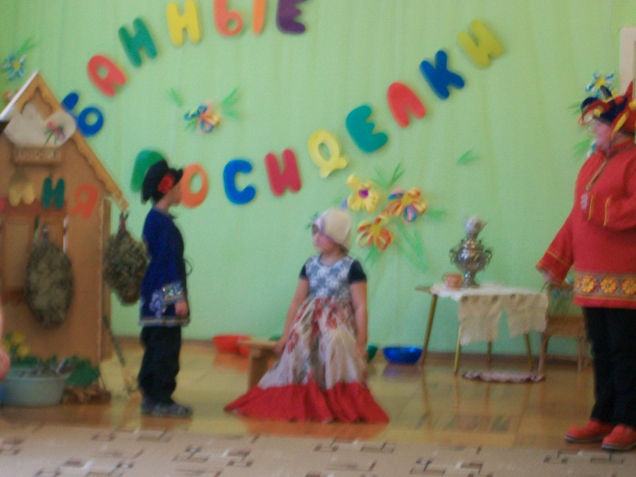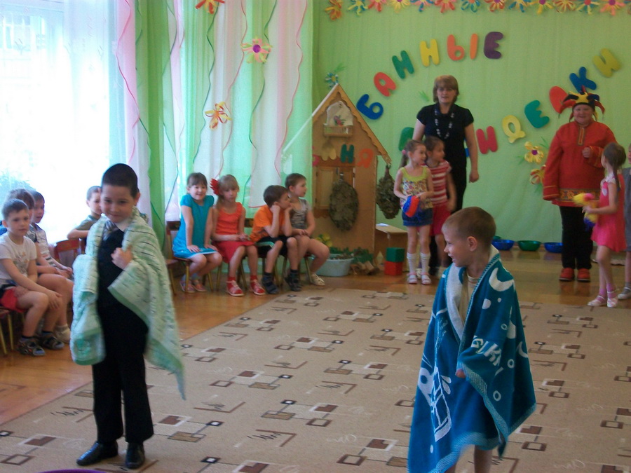 В рамках этой работы впервые в системе дошкольного образования города в детском саду «Радуга» в «чистый четверг» прошло музыкально-театрализованное развлечение «Банные посиделки». Целью проведения развлечения было формирование у детей навыков здорового образа жизни через традиции русской культуры. Зал был оформлен в русском стиле – с самоваром, настоящими вениками и банными атрибутами. Дети рассказывали стихи, пословицы и поговорки о русской бане, отгадывали загадки на «банную» тему, исполнили веселый танец и задорные частушки. Театрализованная миниатюра «Дед и Бабка» рассказала о пользе для здоровья русской бани и веников. И какое же развлечение может обойтись без веселых игр и эстафет. Играли все – и участники, и гости.