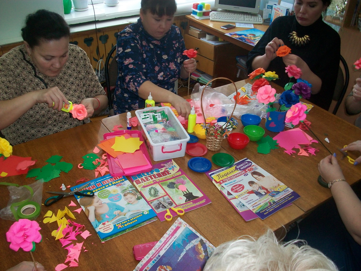 Работа творческих мастерских ДОО представлена разными направлениями. Одно из них - художественно-эстетическое направление. В рамках работы творческой мастерской «Рукодельницы» 14 марта с педагогами был проведен мастер-класс по изготовлению цветов из бумаги. Мастер-класс провела педагог Яковкина Н.В. Она познакомила педагогов с техникой изготовления цветов и литературой, в которой можно найти интересные поделки.