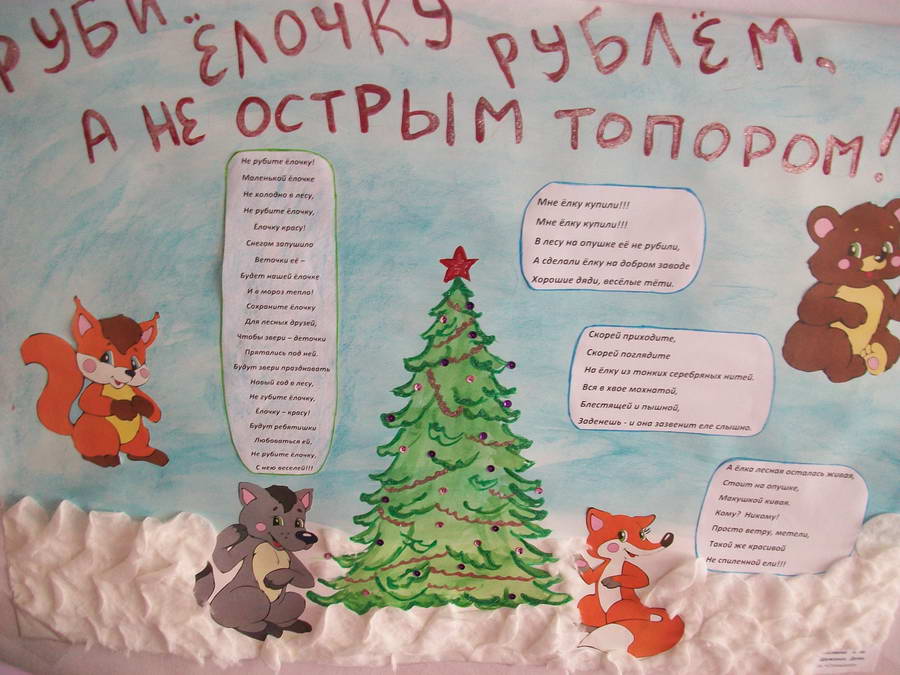 В рамках акции с детьми были проведены занятия познавательного характера, разучивание песен и стихов о лесе и ёлках. Среди воспитанников и родителей прошел конкурс на изготовление ёлок из бросового и подручного материала и выставка плакатов «Защитим ёлочку».
